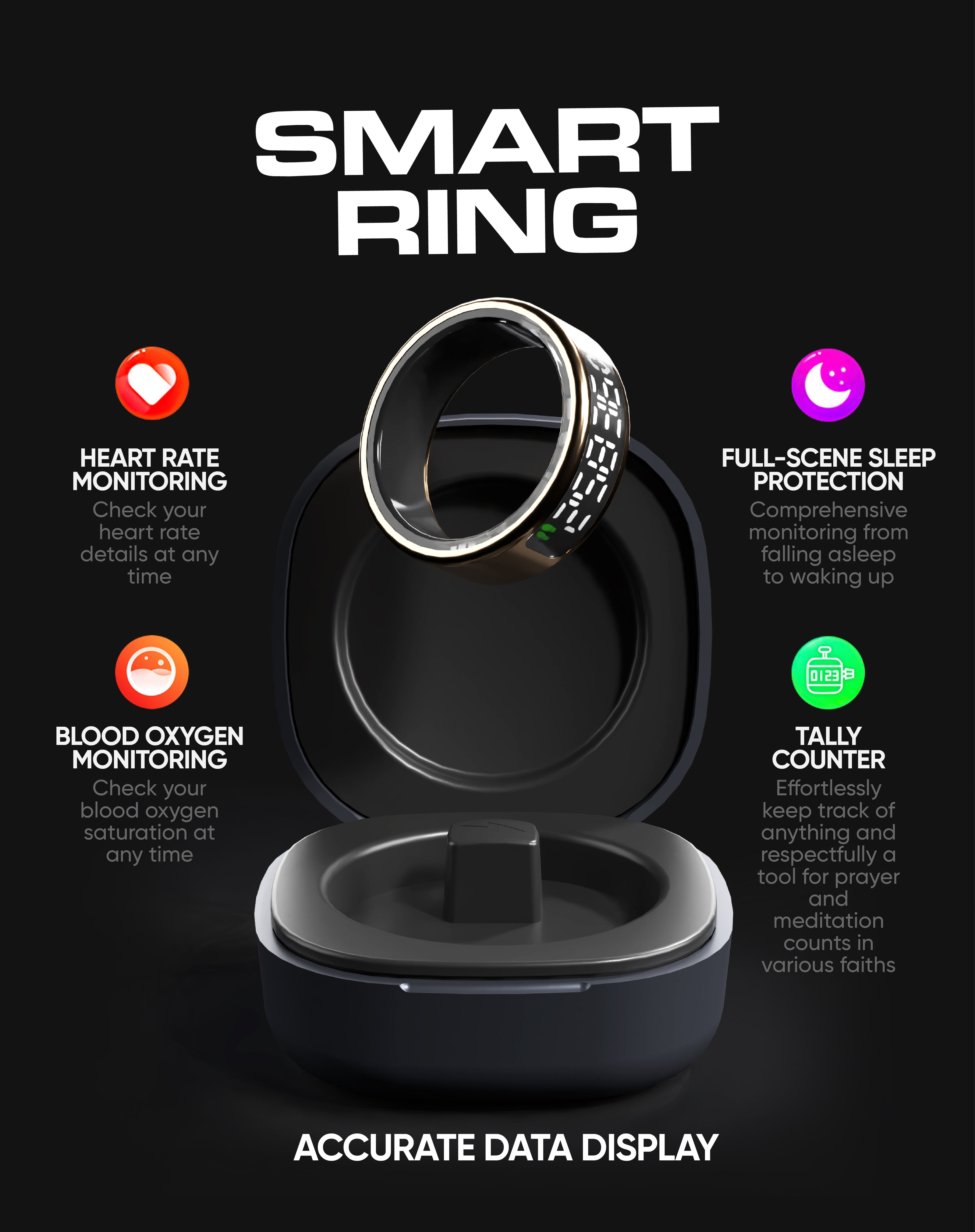 Experience the future of wearable wellness with the Carabat Ring. Designed to fit comfortably on your finger, this sleek smart ring features a real-time display to track your steps, heart rate, sleep, sugar levels, and more. Paired with the RWFit app, you’ll gain full control over your health insights—and even your phone. The included premium magnetic charging box keeps your ring protected and powered with style. It's your perfect balance of fashion, function, and convenience.
