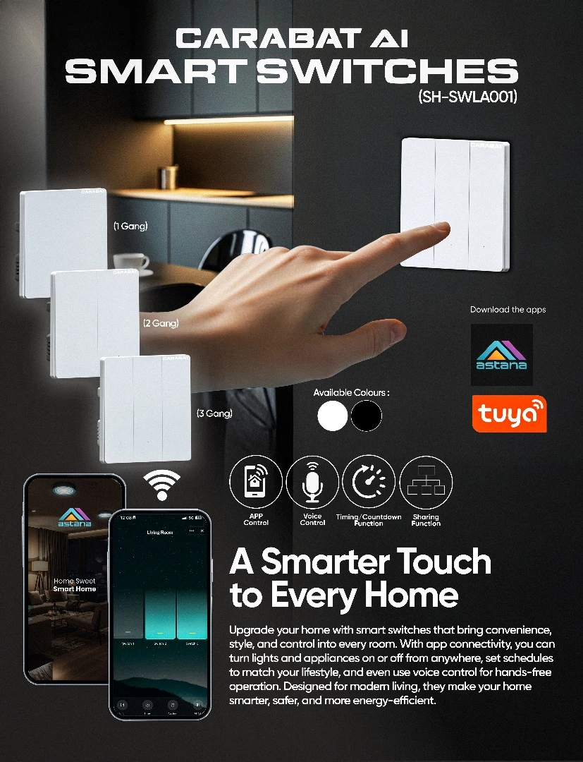Upgrade your home into a true smart home with Carabat AI Smart Switches (SH-SWLA001) — the stylish, intelligent solution for modern living. Designed with premium tempered glass panels and powered by the Astana / Tuya App, these switches let you control your lights and appliances anytime, anywhere.