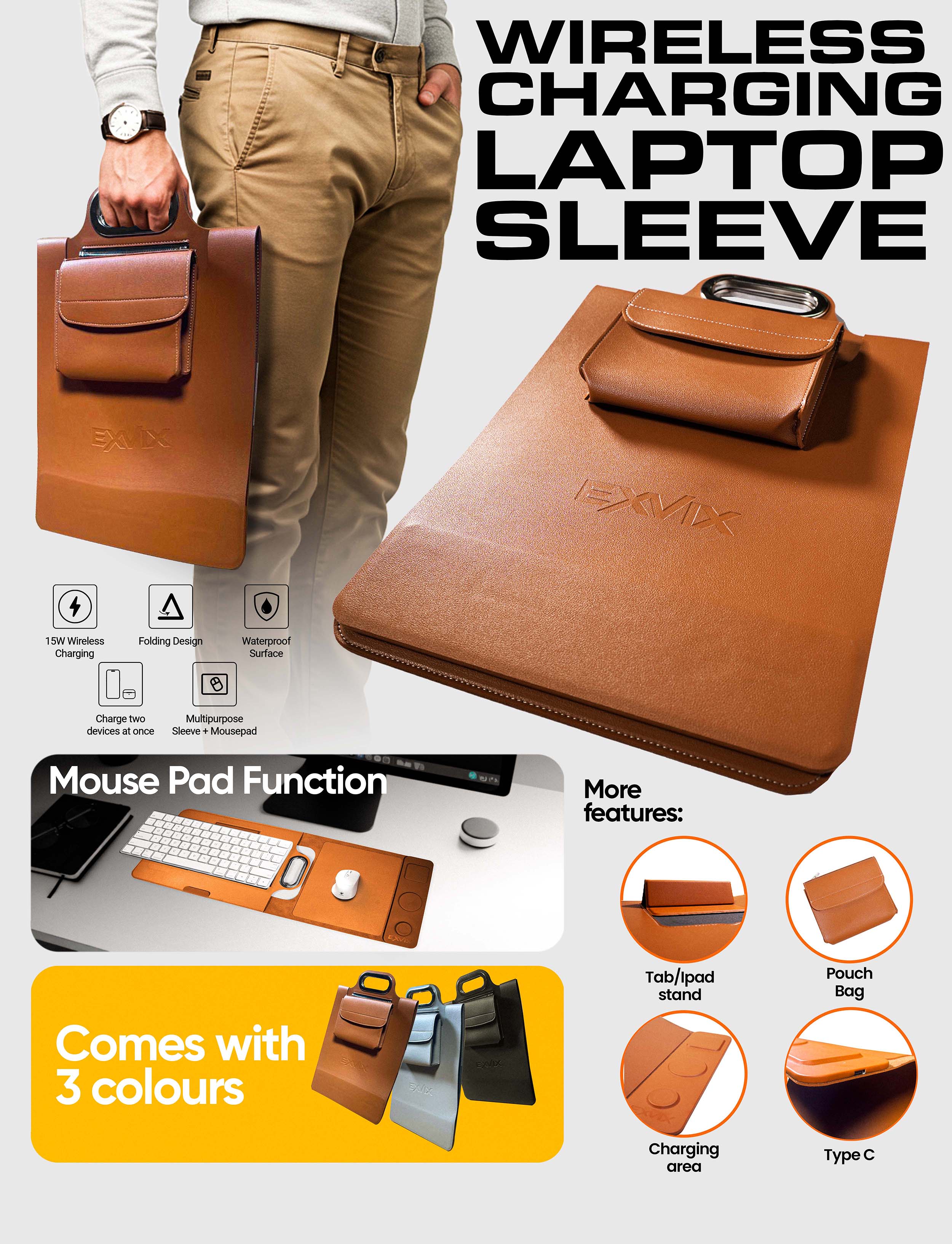 A modern tech-integrated laptop bag designed for productivity on the move. The Exvix Wireless Charging Laptop Bag comes equipped with a detachable pouch bag on the front for extra storage space. When unfolded, it transforms into a work station with a fully functional mouse pad with a 15W wireless charging station on the side that can charge up to 3 devices simultaneously.