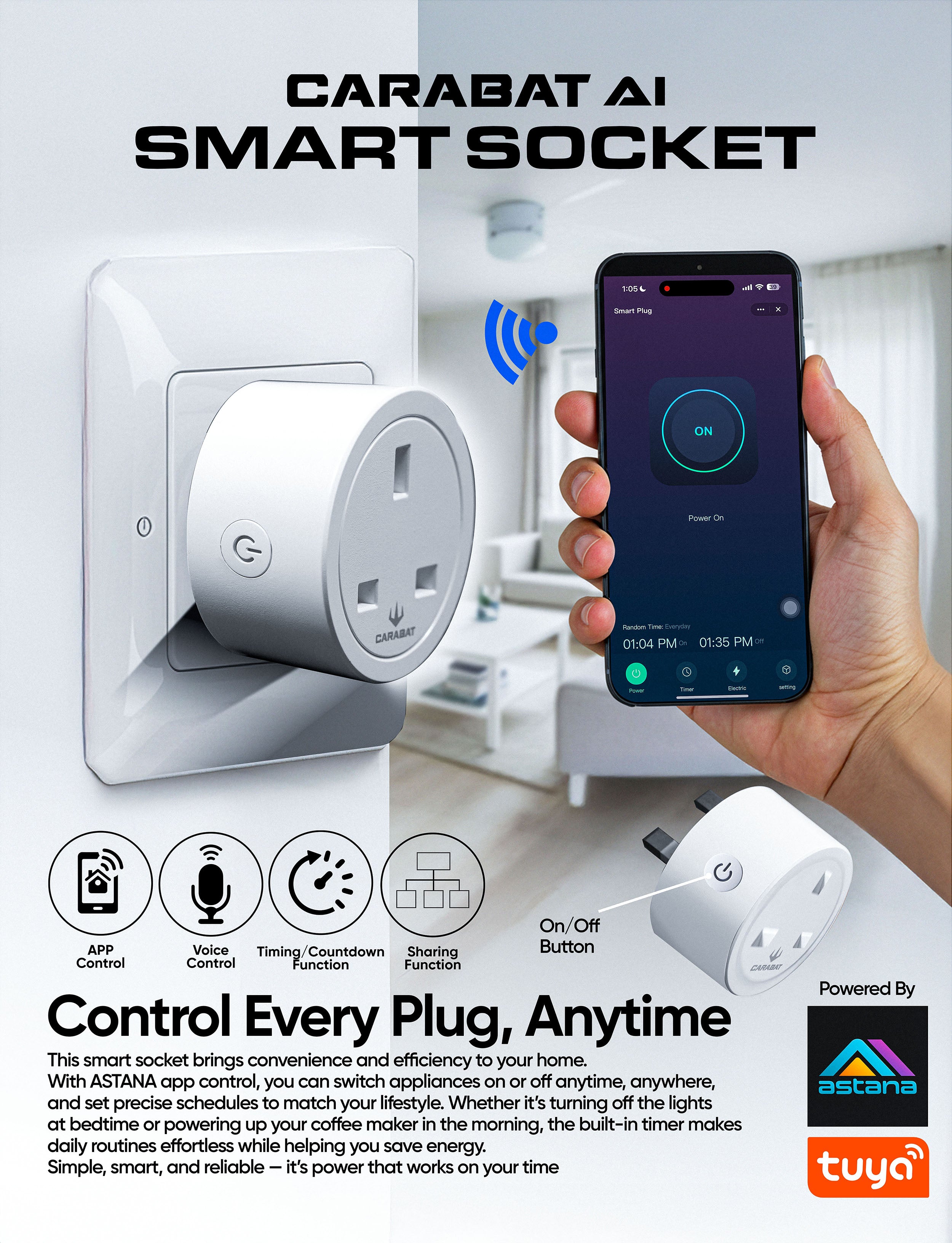 The Carabat Smart Socket 20A combines safety, convenience, and smart control in a compact design. Built with V0 fireproof PC+ABS and CE/RoHS certified, it supports app and voice control from third party, energy monitoring, and scheduling.